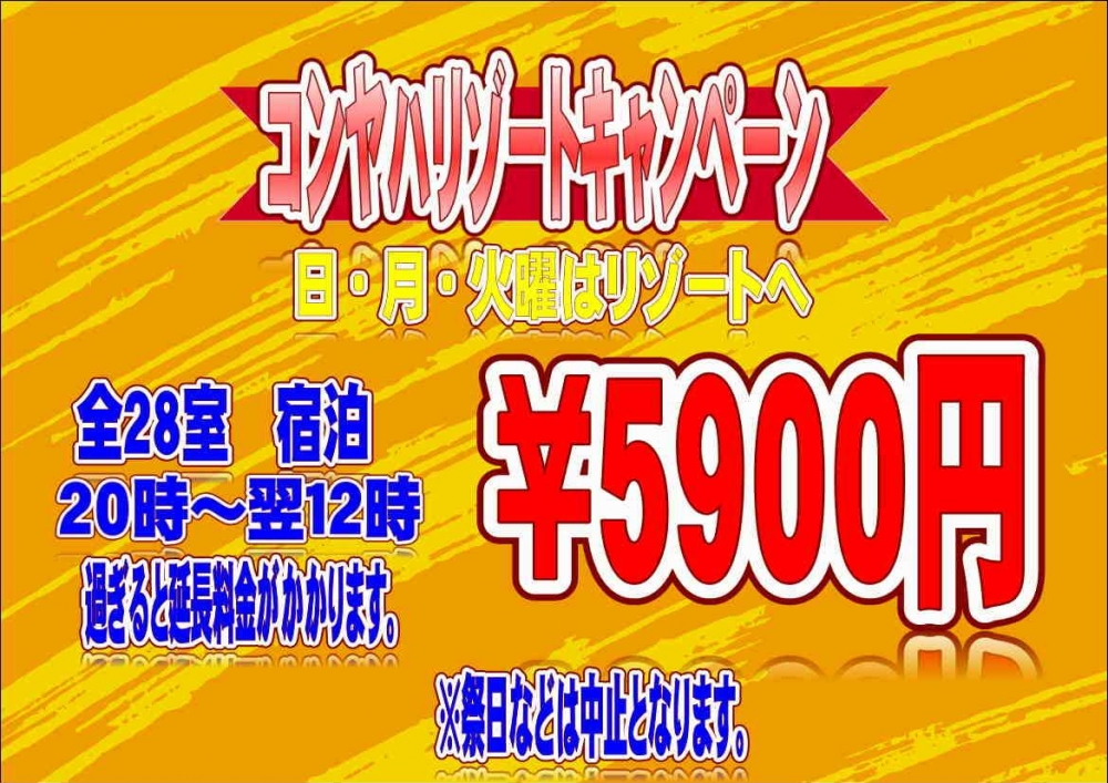 <ご利用時間> ■日~木曜日 20時~翌12時 ■金・土・祝前日 20時~翌10時 ”今夜はリゾート”プラン 日~火曜日/20時~翌12時 <ご利用料金> ■日~金曜日 8,200円~9,000円(税込) ■土・祝前日 9,700円~11,000円(税込) |